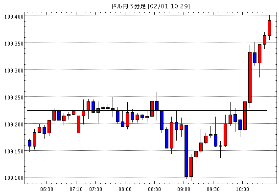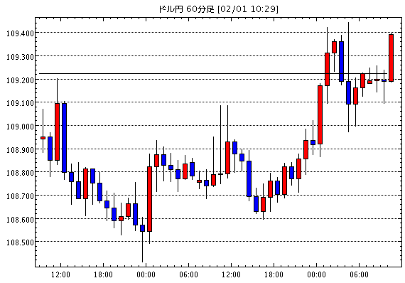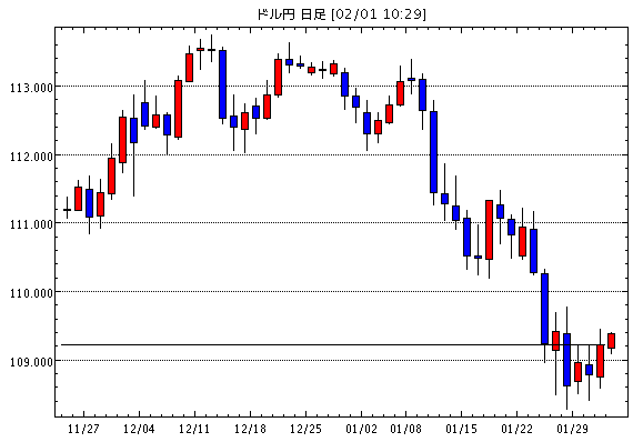 1月31日のドル・円相場は、東京市場では109円09銭から108円60銭まで下落。